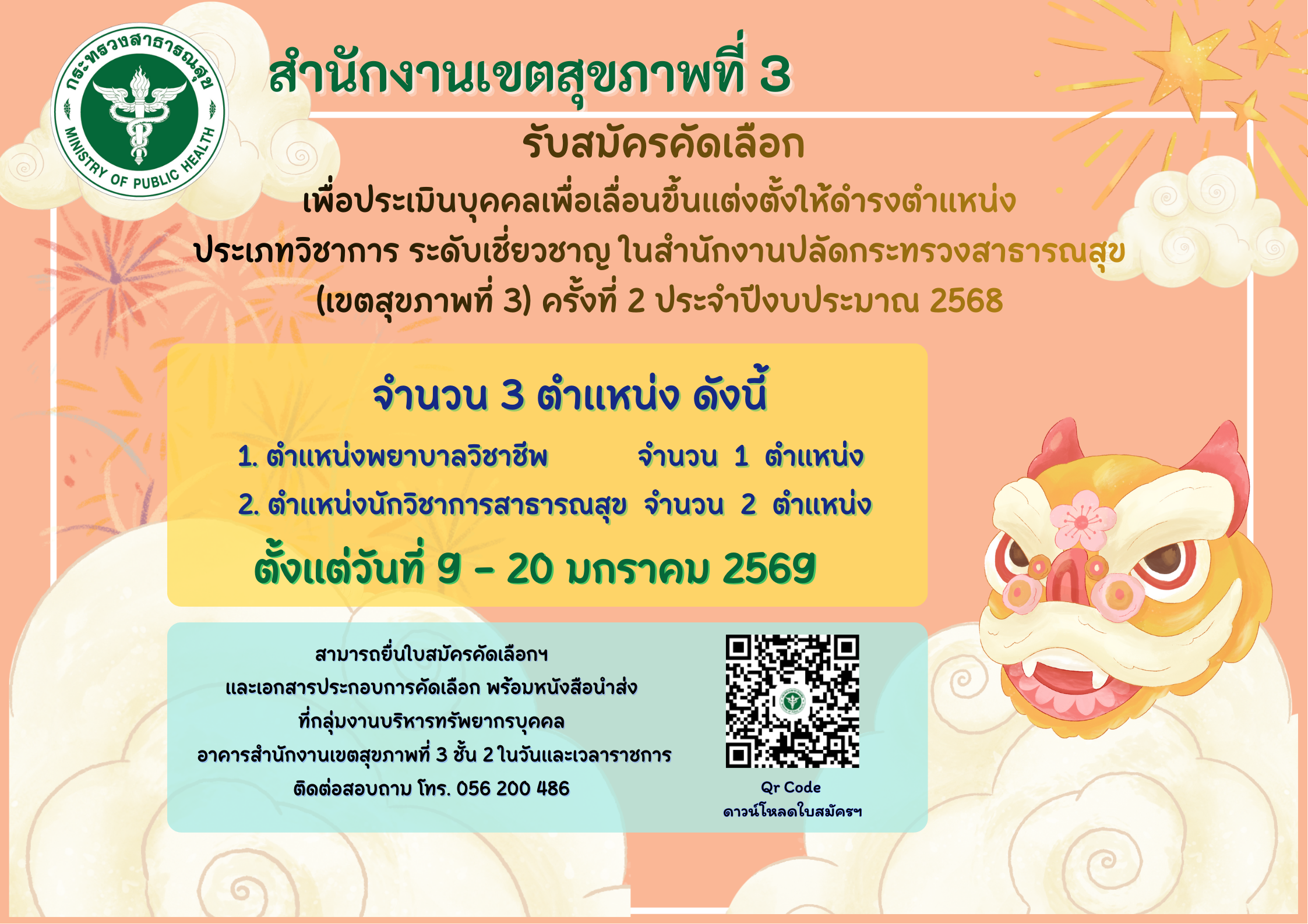 - ประกาศคณะกรรมการประเมินบุคคลฯ เรื่อง รับสมัครคัดเลือกเพื่อประเมินบุคคลเพื่อเลื่อนขึ้นแต่งตั้งให้ดำรงตำแหน่ง ประเภทวิชาการ ระดับเชี่ยวชาญ ในสำนักงานปลัดกระทรวงสาธารณสุข (เขตสุขภาพที่ 3)