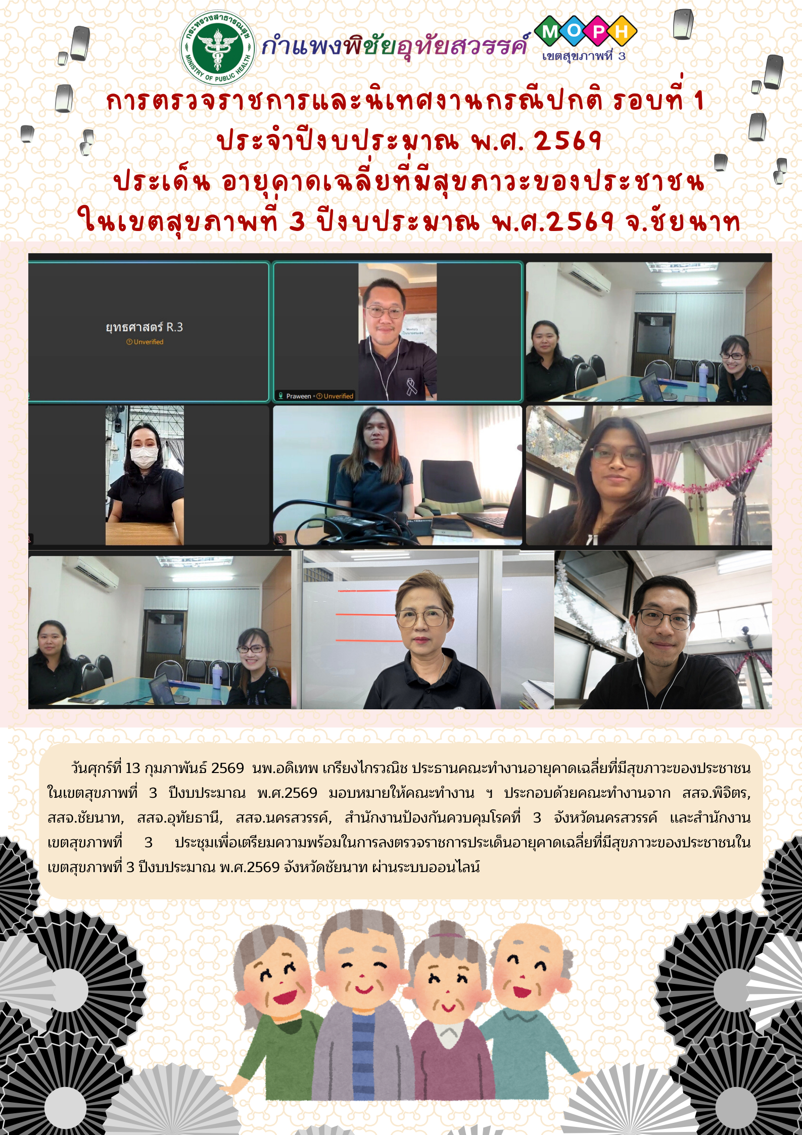 การตรวจราชการและนิเทศงานกรณีปกติ รอบที่ 1 ประจำปีงบประมาณ พ.ศ. 2569 ประเด็น อายุคาดเฉลี่ยที่มีสุขภาวะของประชาชน ในเขตสุขภาพที่ 3 ปีงบประมาณ พ.ศ.2569 จ.ชัยนาท