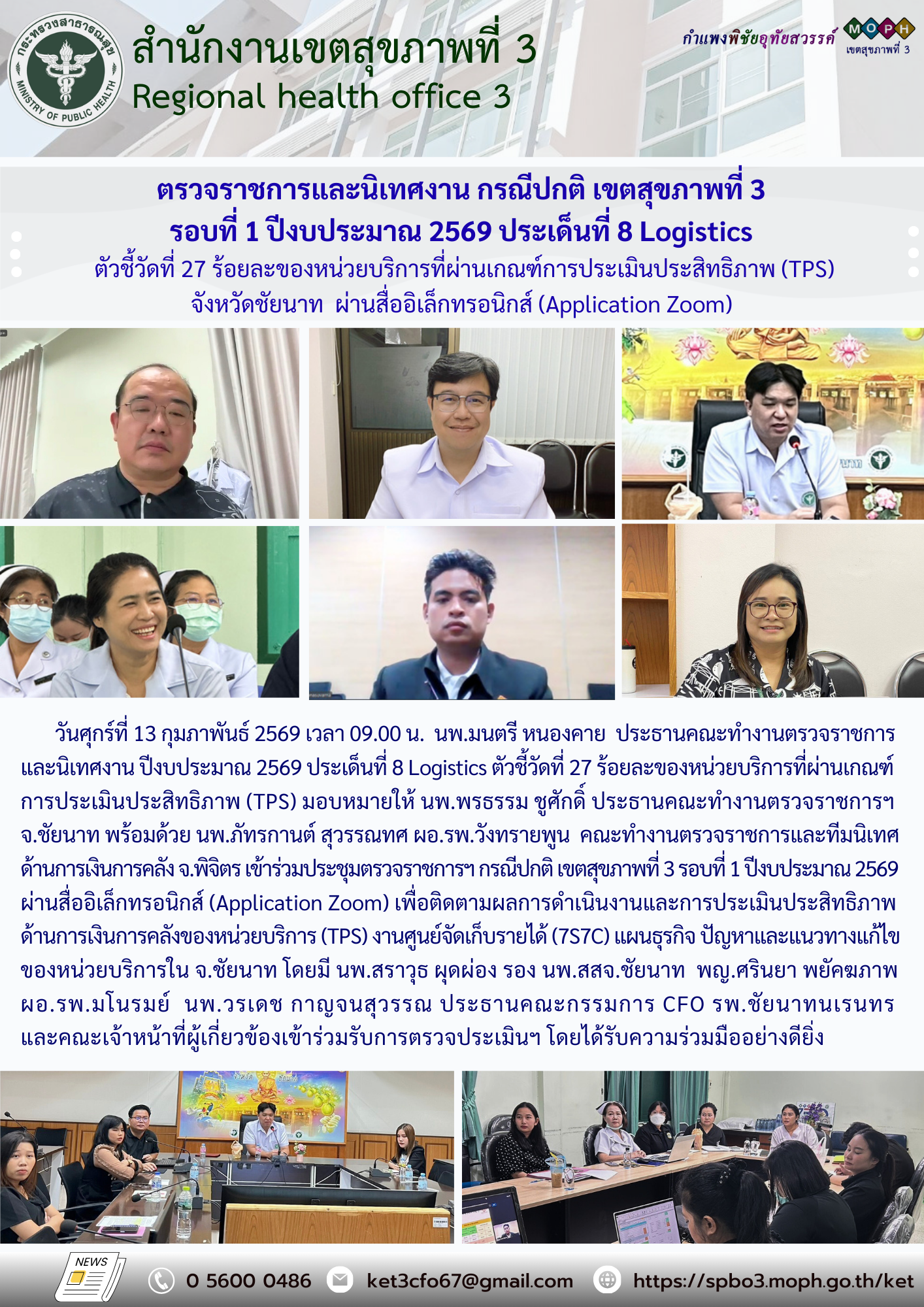 ตรวจราชการและนิเทศงาน กรณีปกติ รอบที่ 1/2569 ประเด็นที่ 8 ตัวชี้วัดที่ 27 ด้านการเงินการคลัง จังหวัดชัยนาท วันที่ 13 กุมภาพันธ์ 2569 ผ่านระบบ Zoom