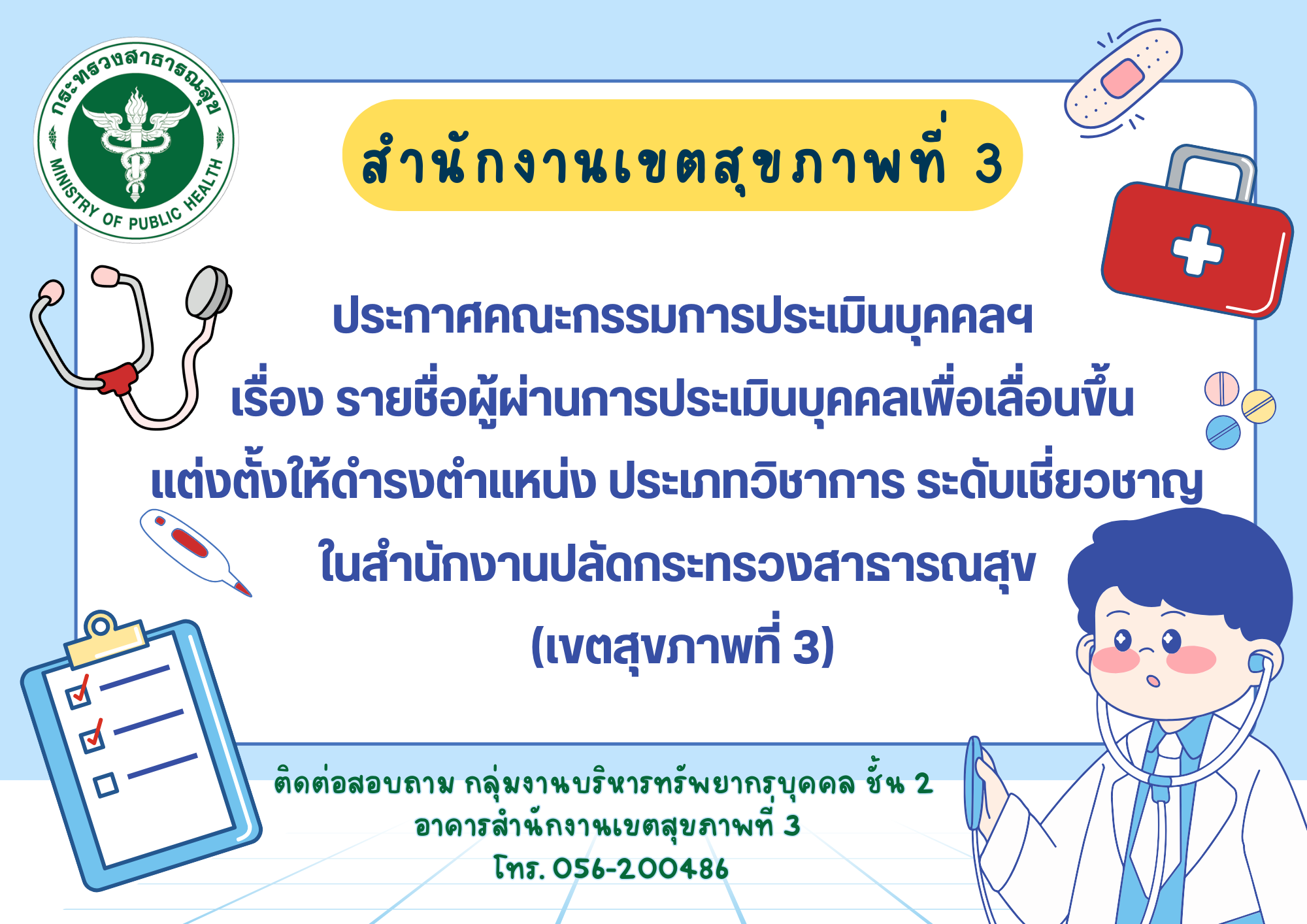 ประกาศคณะกรรมการประเมินบุคคลฯ เรื่อง รายชื่อผู้ผ่านการประเมินบุคคลเพื่อเลื่อนขึ้นแต่งตั้งให้ดำรงตำแหน่ ประเภทวิชาการ ระดับเชี่ยวชาญ ในสำนักงานปลัดกระทรวงสาธารณสุข (เขตสุขภาพที่ 3)