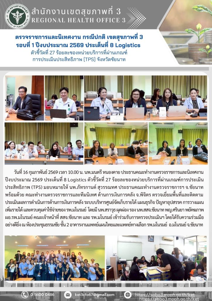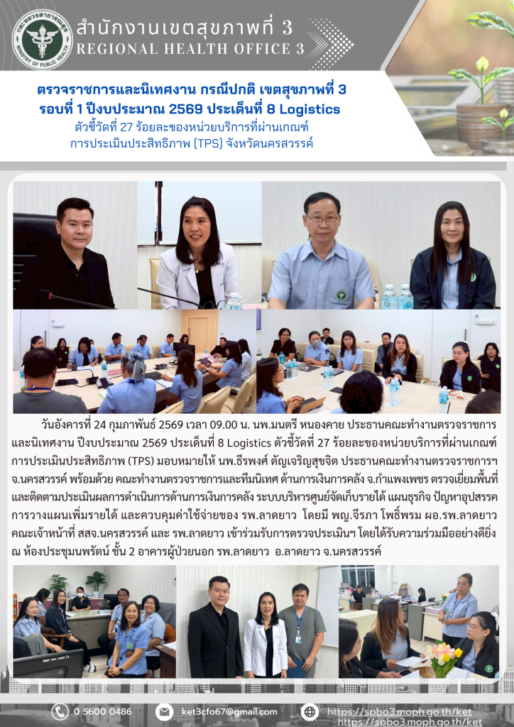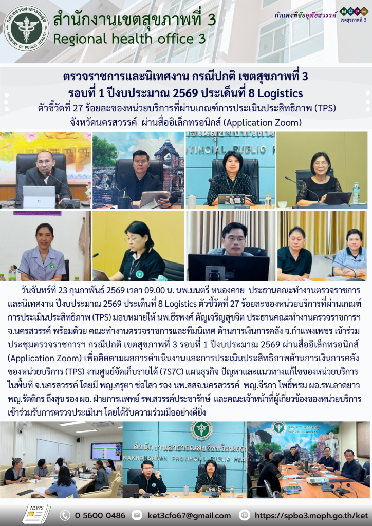 ข่าวประชาสัมพันธ์ ตรวจราชการและนิเทศงาน กรณีปกติ รอบที่ 1/2569 ประเด็นที่ 8 ตัวชี้วัดที่ 27 ด้านการเงินการคลัง วันที่ 24 กุมภาพันธ์ 2569 ณ รพ.ลาดยาว จ.นครสวรรค์ ...อ่านเพิ่มเติม กุมภาพันธ์ 24, 2026 / กิจกรรม, ข่าวกลุ่มงาน CFO, ข่าวกิจกรรม, ข่าวสารล่าสุด, งานบริหารการเงินและการคลัง ตรวจราชการและนิเทศงาน กรณีปกติ รอบที่ 1/2569 ประเด็นที่ 8 ตัวชี้วัดที่ 27 ด้านการเงินการคลัง จังหวัดนครสวรรค์ วันที่ 23 กุมภาพันธ์ 2569 ผ่านระบบ Zoom ...อ่านเพิ่มเติม กุมภาพันธ์ 23, 2026 / กิจกรรม, ข่าวกลุ่มงาน CFO, ข่าวกิจกรรม, ข่าวสารล่าสุด, งานบริหารการเงินและการคลัง ตรวจราชการและนิเทศงาน กรณีปกติ รอบที่ 1/2569 ประเด็นที่ 8 ตัวชี้วัดที่ 27 ด้านการเงินการคลัง วันที่ 16 กุมภาพันธ์ 2569 ณ รพ.มโนรมย์ จ.ชัยนาท ...อ่านเพิ่มเติม กุมภาพันธ์ 16, 2026 / กิจกรรม, ข่าวกลุ่มงาน CFO, ข่าวกิจกรรม, ข่าวสารล่าสุด, งานบริหารการเงินและการคลัง